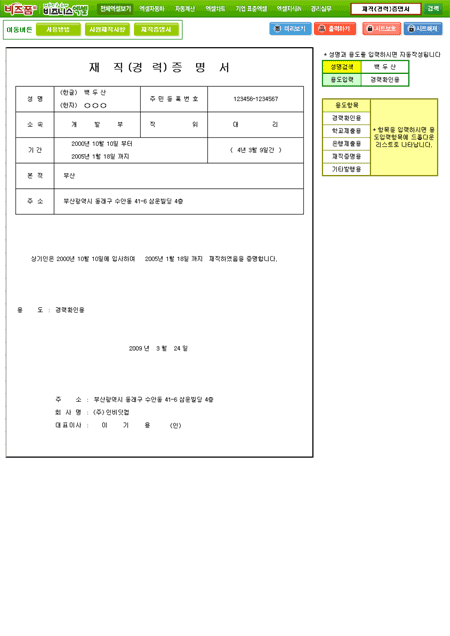 9,000원/월재직(경력)증명서 자동화서식 일반적인 재직(경력) 증명서를 개인신상 정보 (성명, 주민등록번호, 소속, 직위, 기간, 본적, 주소)를 기입합니다. 개인신상 입력자별로 관리할수도 있고, 사용용도에 따라서 자동으로 출력할수 있는 자동화 서식입니다.