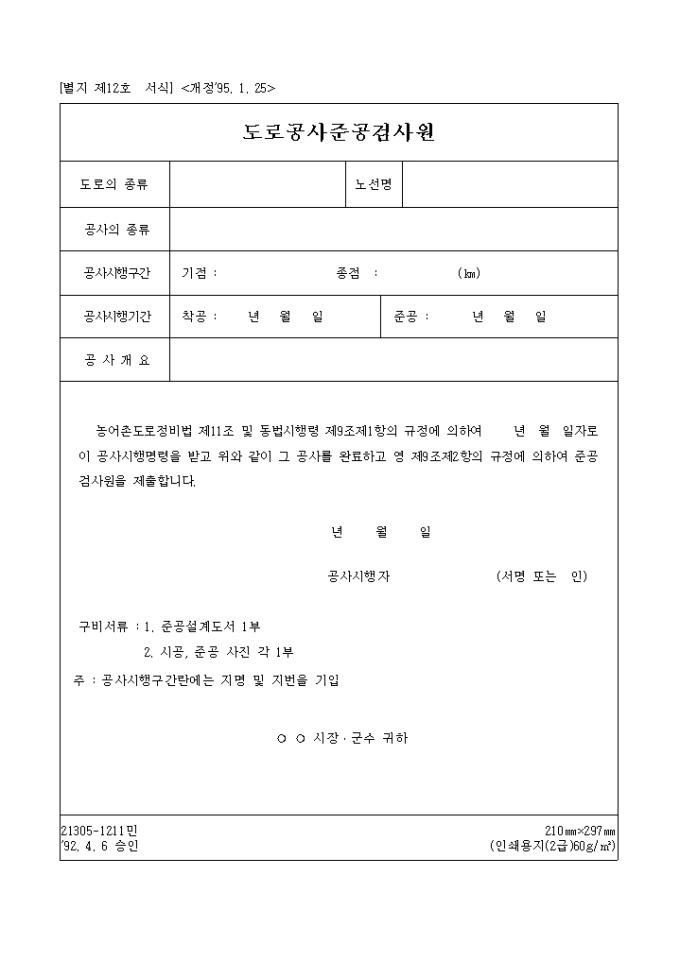 9,000원/월농어촌도로정비법 제11조 및 동법시행령 제9조제1항의 규정에 의하여 년 월 일자로 이 공사시행명령을 받고 위와 같이 그 공사를 완료하고 영 제9조제2항의 규정에 의하여 준공검사원을 제출할 때 사용하는 도로공사 준공검사원 양식입니다.