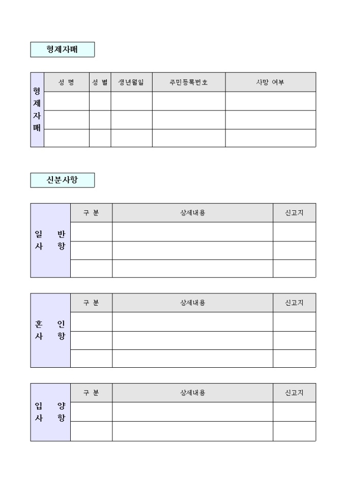 9,000원/월가족사항 및 형제자매, 신분사항에 대한 인적사항을 기록하여 신원을 확인하는 신분등록원부 양식입니다.
