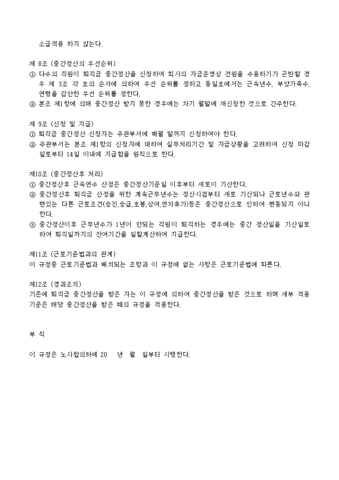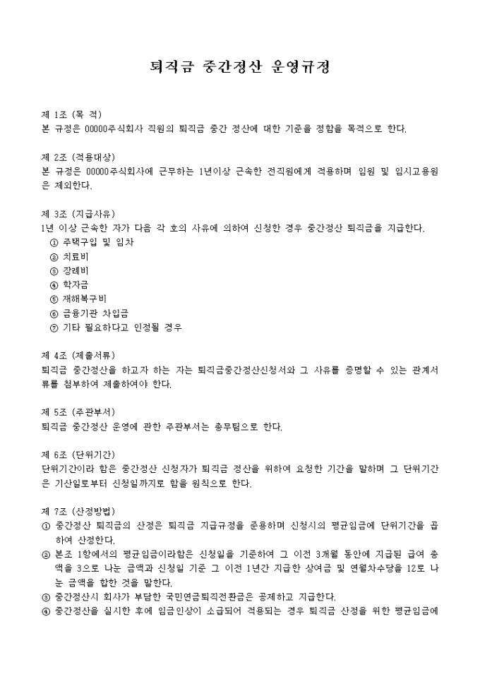9,000원/월퇴직금 중간 정산 운영규정(12개조항)입니다. 아래의 목차를 참고하세요 제 1조 (목 적) 제 2조 (적용대상) 제 3조 (지급사유) 제 4조 (제출서류) 제 5조 (주관부서) 제 6조 (단위기간) 제 7조 (산정방법) 제 8조 (중간정산의 우선순위) 제 9조 (신청 및 지급) 제10조 (중간정산후 처리) 제11조 (근로기준법과의 관계) 제12조 (경과조치)