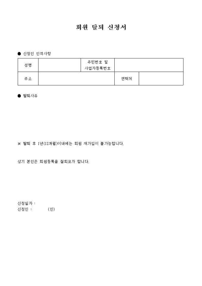 9,000원/월회원인적사항,탈퇴사유를 기재하는 회원 탈퇴 신청서입니다.