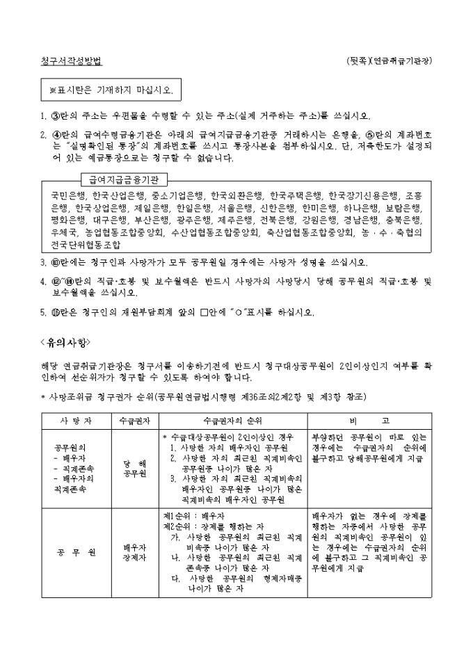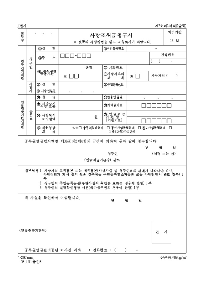 9,000원/월공무원연금법시행령 제36조의2제4항의 규정에 의하여 위와 같이 청구할 때 사용하는 사망 조위금 청구서 양식입니다.
