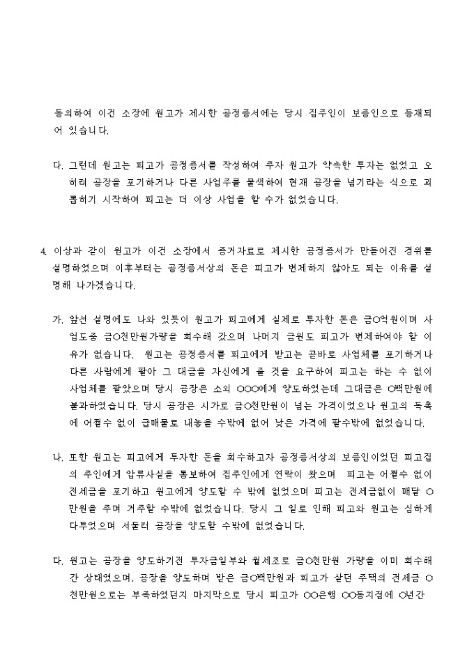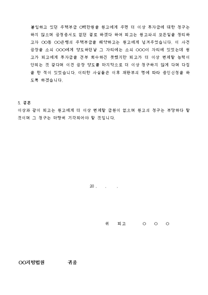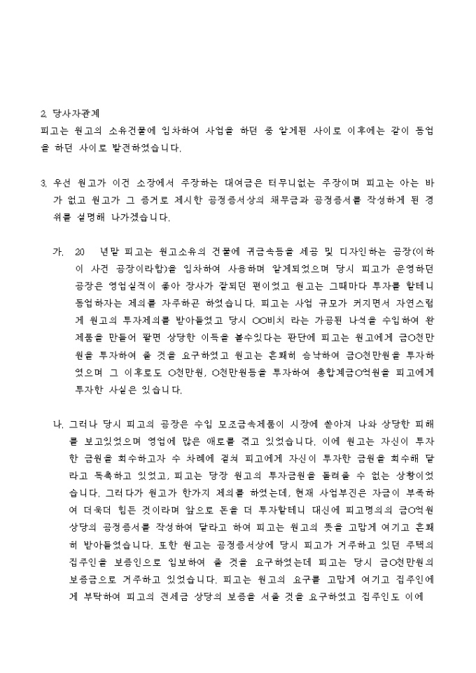 9,000원/월원고의 대여금반환청구소송에 대해 , 본 건 채무는 대여금이 아니라 원고가 피고의 회사에 투자한 것임을 주장하는 피고의 답변서입니다.