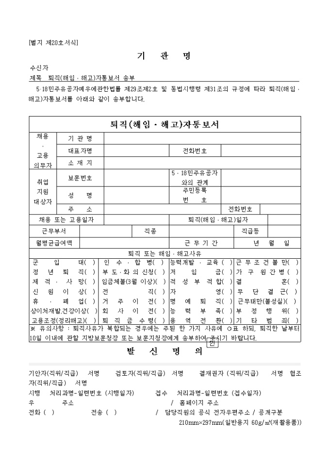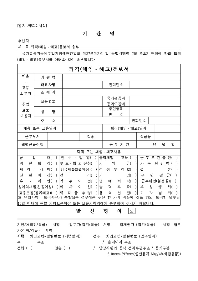 9,000원/월취업보호대상자의 퇴직을 알리는 서식입니다. 취업보호대상자의 신상명세와 고용의무자의 신상명세를 기입하는 칸으로 구성되어 있습니다.