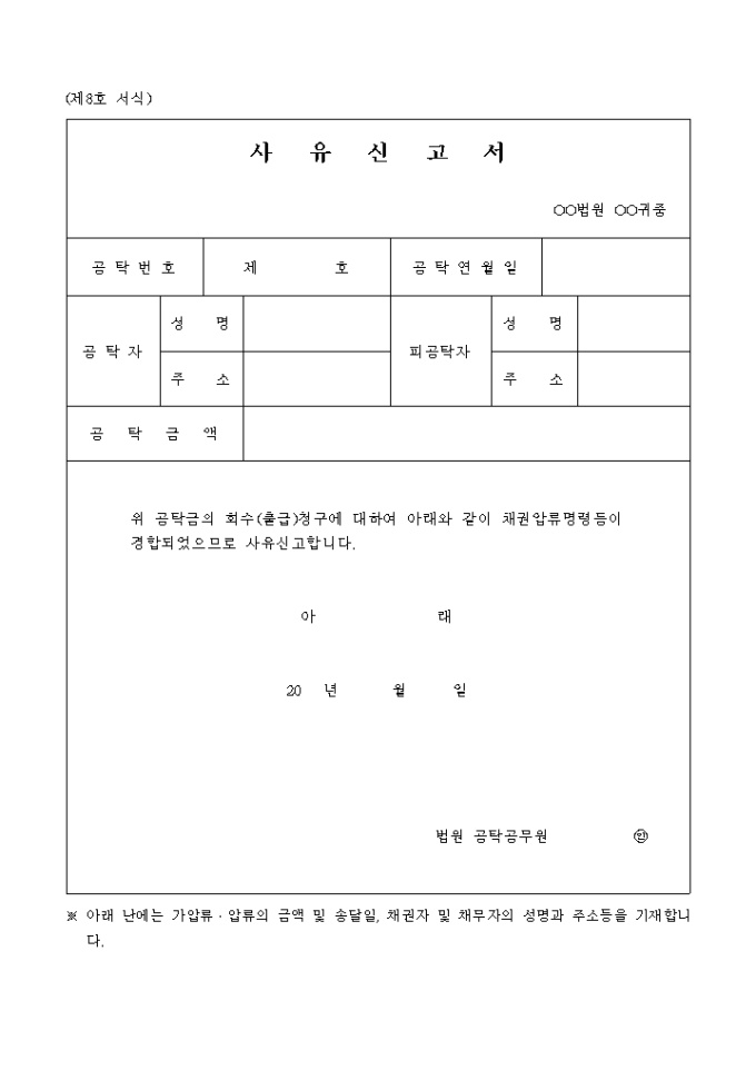 9,000원/월공탁금의 출급및 회수의 사유를 신고하는 양식입니다.