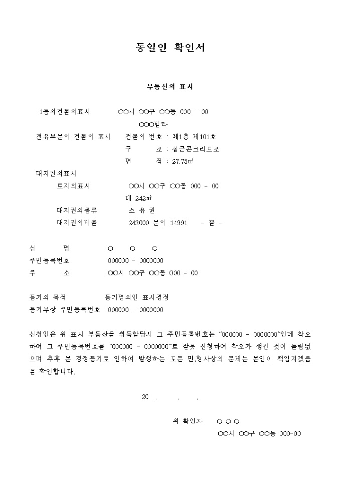 9,000원/월주민등록번호의 착오기재를 경정할때 동일인임을 확인하고 보증한다는 내용의 동일인확인서입니다.