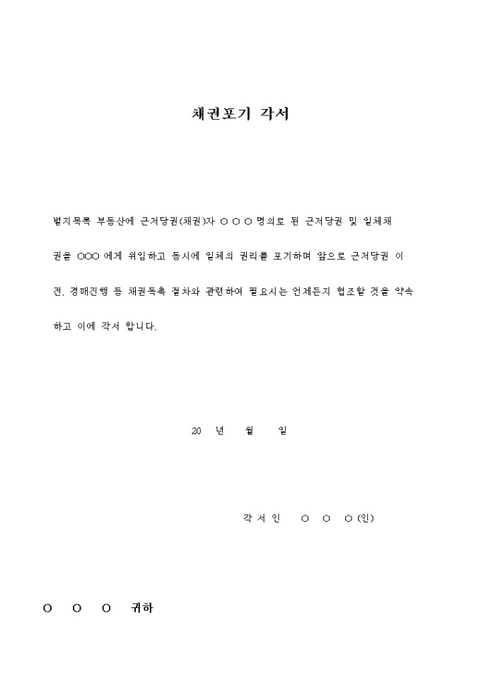 9,000원/월근저당권 및 일체의 채권을 포기하는 것을 내용으로 하는 채권포기 각서입니다.