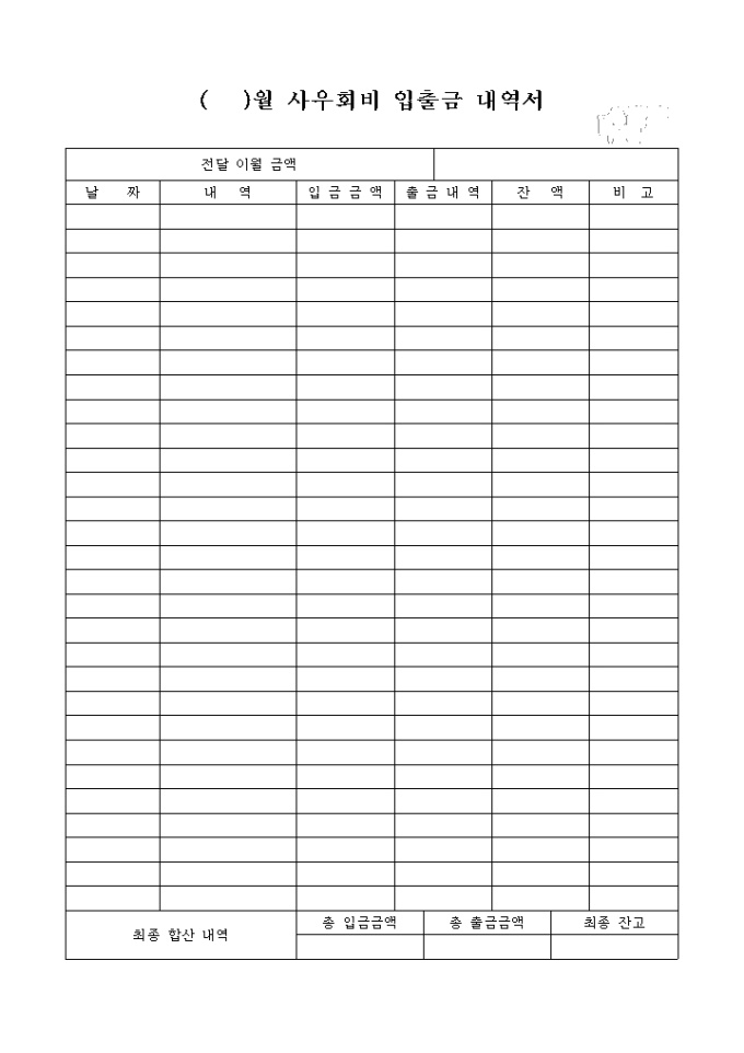 9,000원/월한달간 사우회비 입출력 내역을 기재하는 양식입니다.