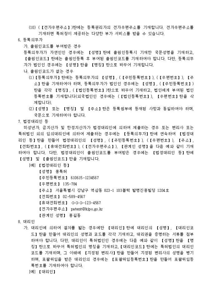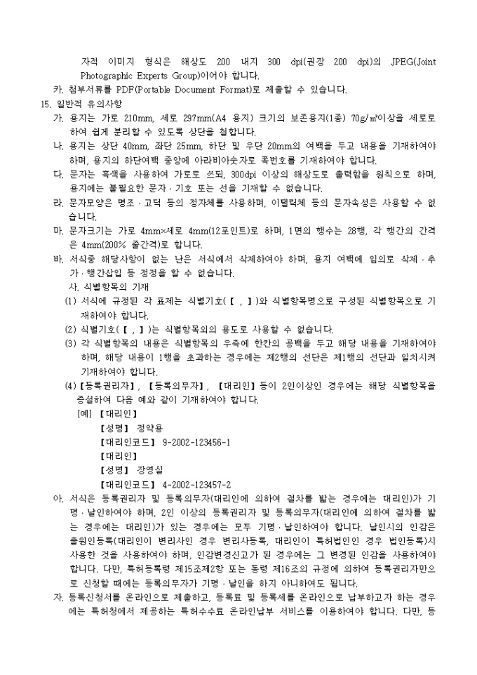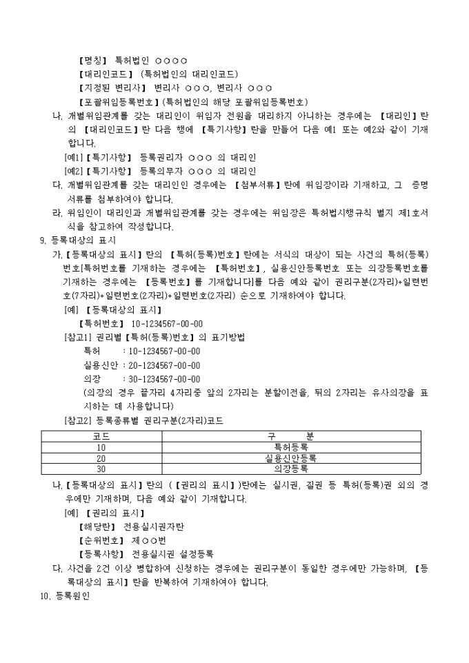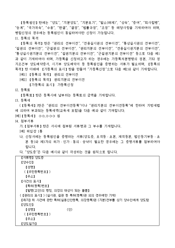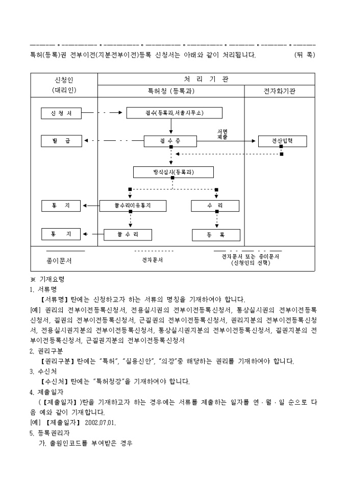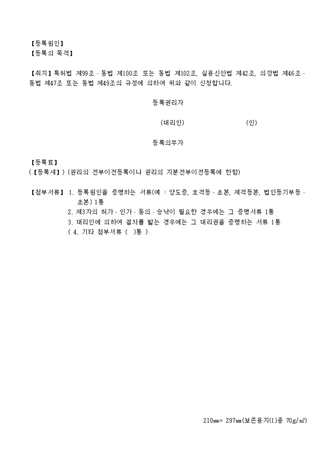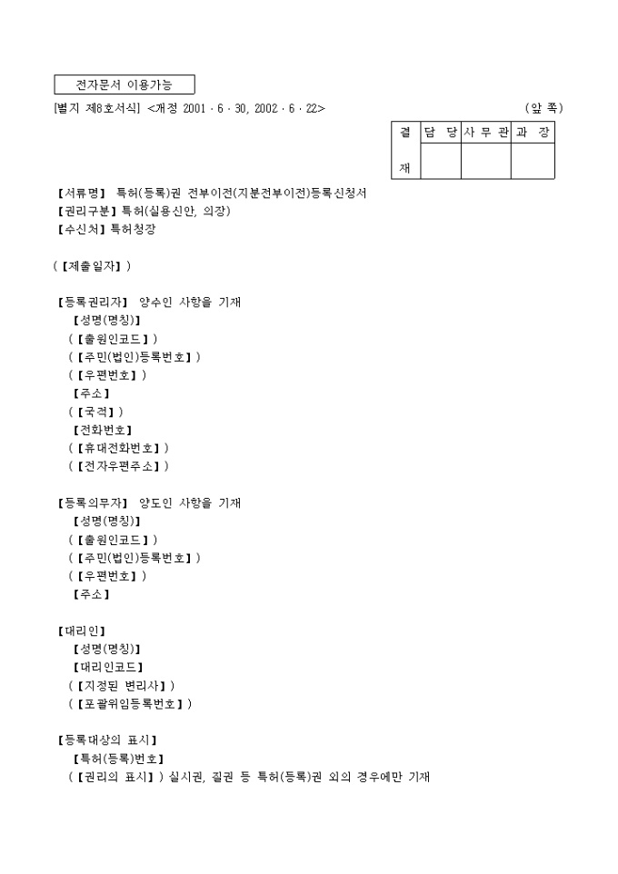 9,000원/월이 서식은 [별지 제8호서식]특허(등록)권 전부이전(지분전부이전)등록신청로서 필요한 서류로는 등록원인을 증명하는 서류(예 : 양도증, 호적등·초본, 제적등본, 법인등기부등·초본) 1통, 제3자의 허가·인가·동의·승낙이 필요한 경우에는 그 증명서류 1통, 대리인에 의하여 절차를 밟는 경우에는 그 대리권을 증명하는 서류 1통, 기타 첨부서류 ( )통이 있습니다.