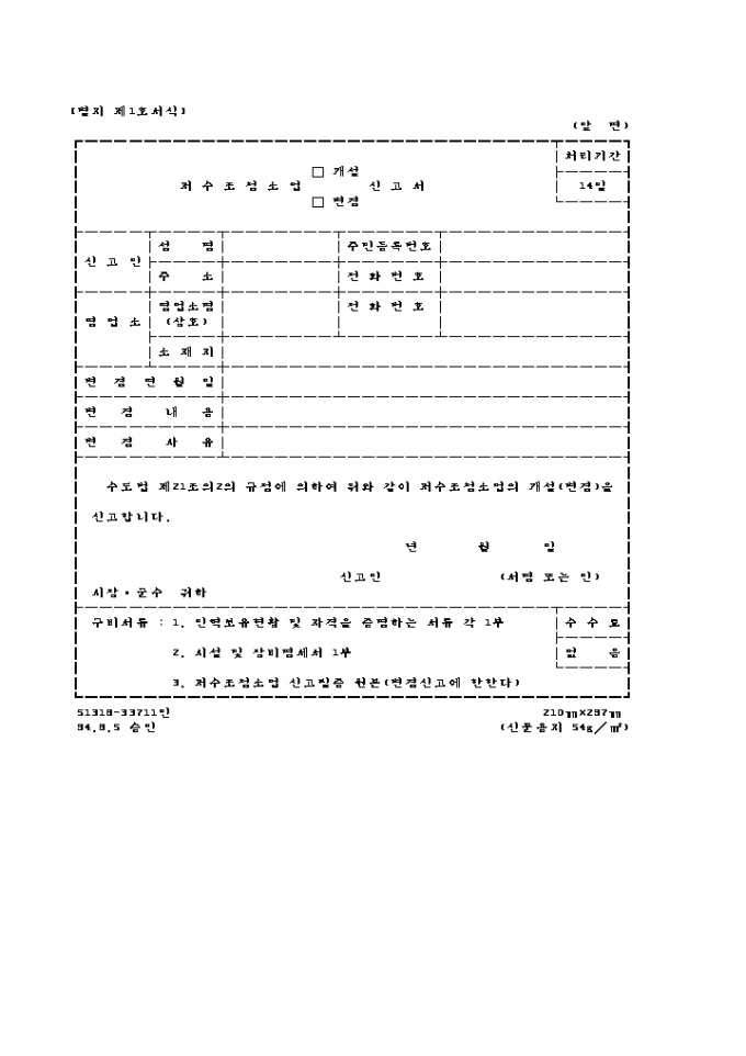 9,000원/월수도법 제21조의2의 규정에 의하여 위와 같이 저수조청소업의 개설(변경)을 신고할 때 사용하는 '저수조 청소업(개설,변경)신고서' 양식입니다.