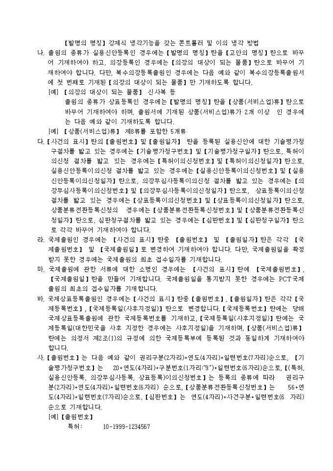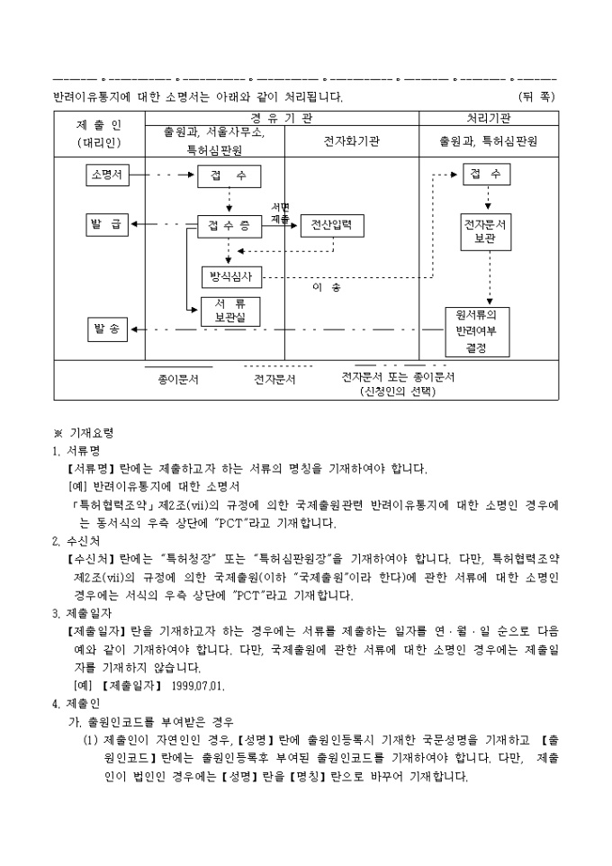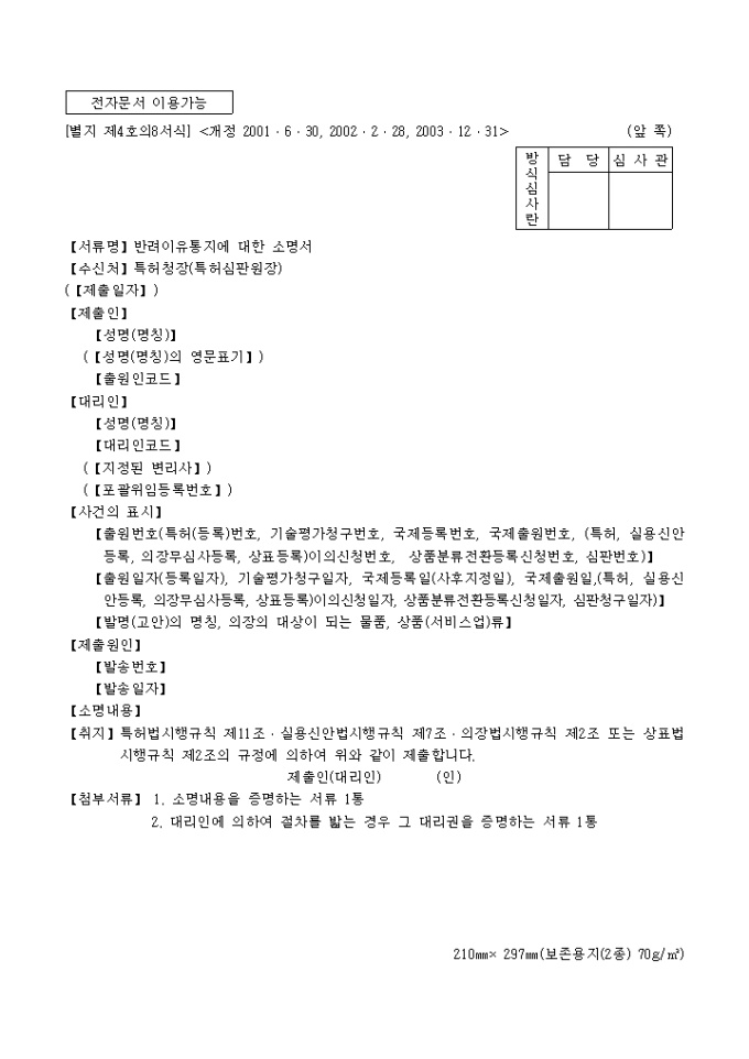 9,000원/월특허법시행규칙 제11조·실용신안법시행규칙 제7조·의장법시행규칙 제2조 또는 상표법시행규칙 제2조의 규정에 의거한 반려이유통지에 대한 소명서 입니다. 소명내용을 증명하는 서류 1통, 대리인에 의하여 절차를 밟는 경우 그 대리권을 증명하는 서류 1통이 첨부되어야 합니다.