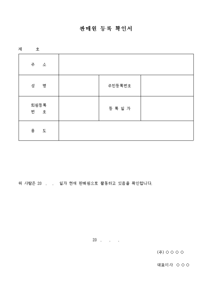 주소, 성명, 주민등록번호, 회원등록번호, 등록일자 등을 기록하고 현재 판매원으로 활동하고 있음을 확인시에 제출하는 양식입니다.