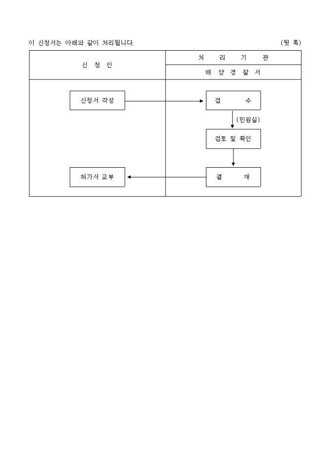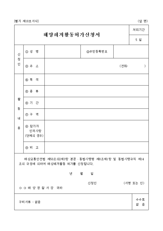 9,000원/월해상교통안전법 제50조의2제3항 본문ㆍ동법시행령 제8조제1항 및 동법시행규칙 제14조의 규정에 의거한 해양레저활동허가신청서로서 신청인 인적사항(성명, 주소, 주민등록번호), 활동내용(목적, 종류, 기간, 구역, 참가자 인적사항)을 기재합니다.