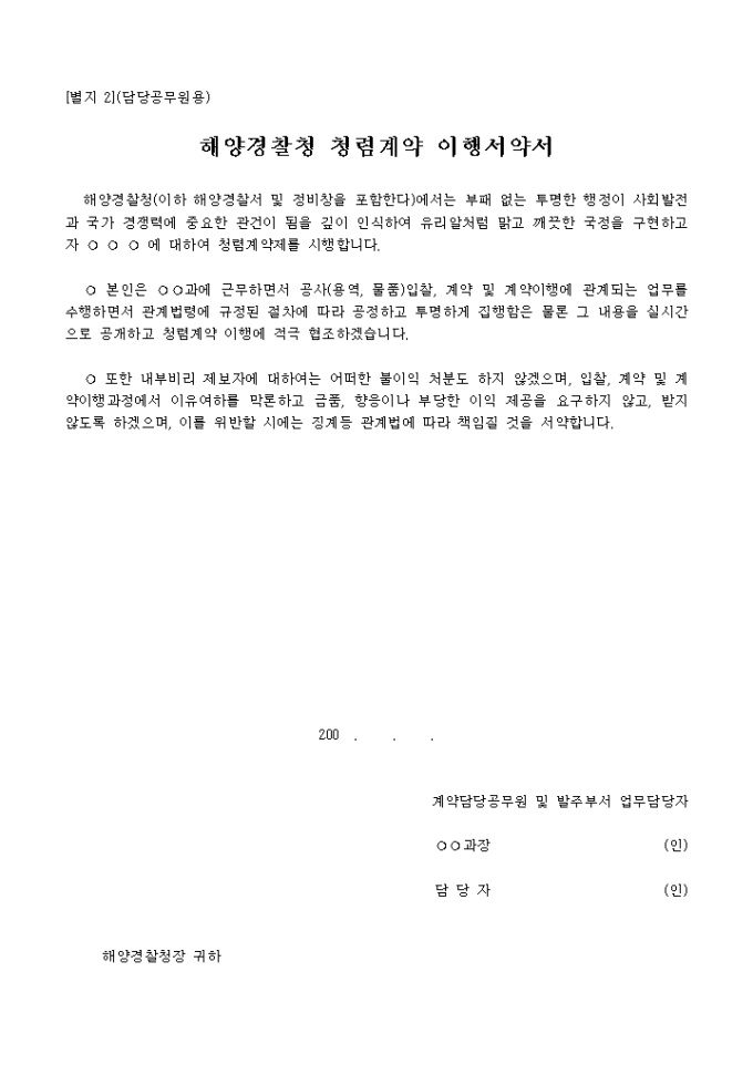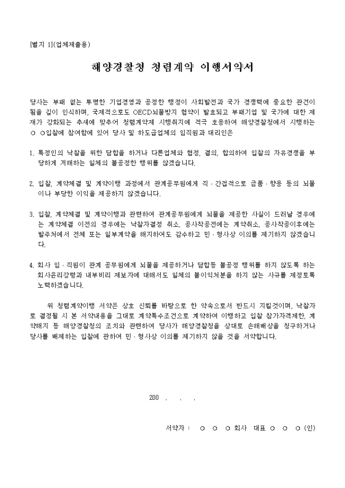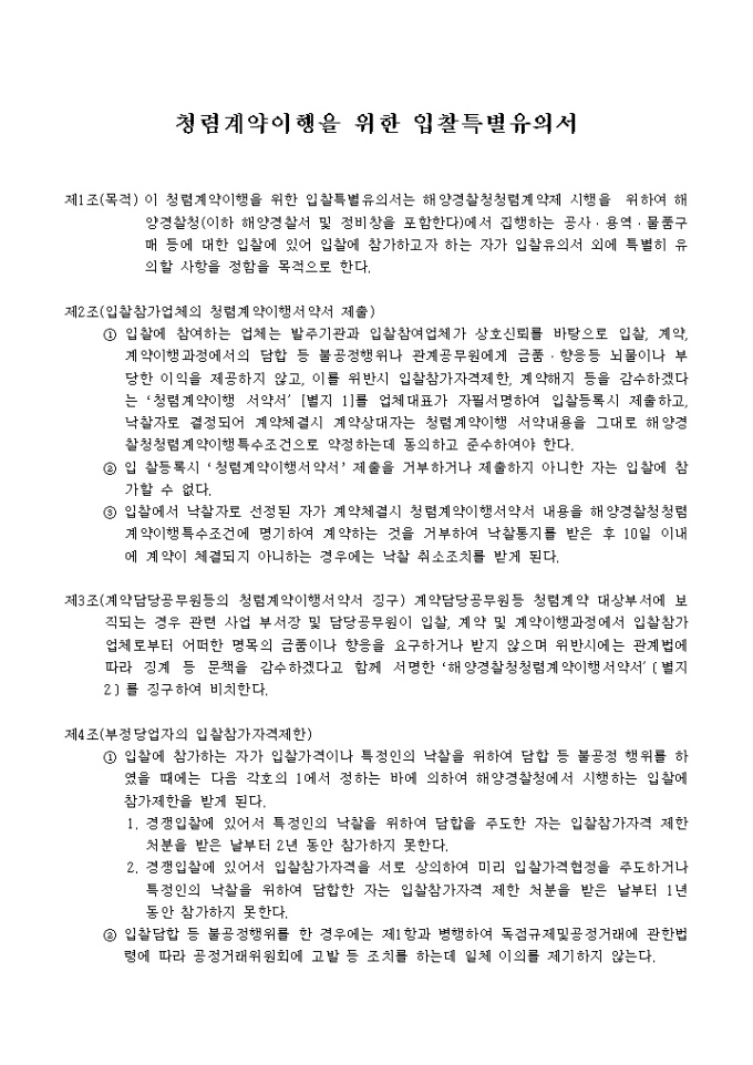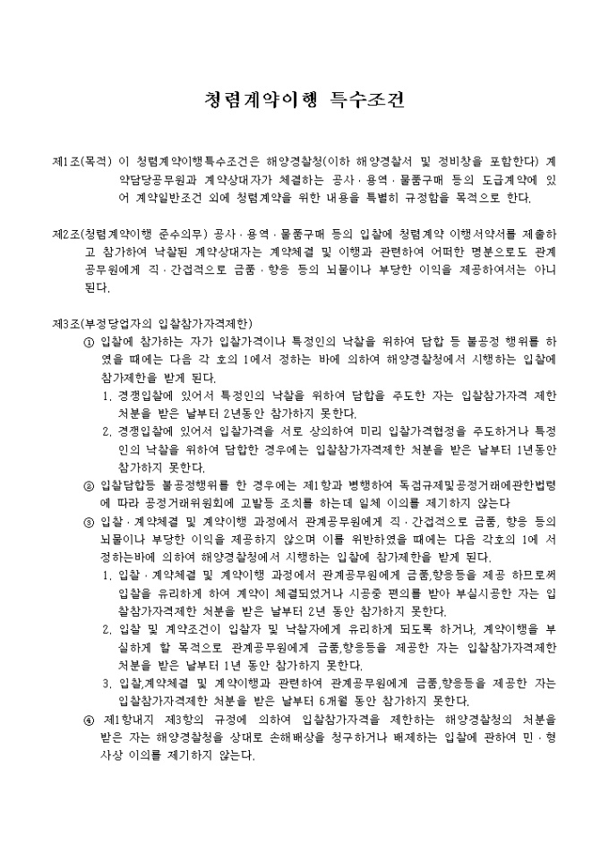 9,000원/월청렴계약이행을 위한 입찰특별유의서, 해양경찰청 청렴계약 이행서약서, 청렴계약이행 특수조건, 해양경찰청 청렴계약 이행서약서로 구성되어 있는 청렴계약 시행 실시안내문입니다.