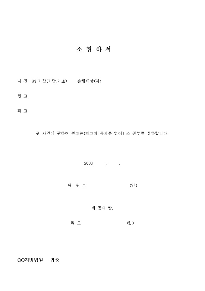 9,000원/월손해배상(자) 사건에 관하여 원고가(피고의 동의를 얻어) 소 전부를 취하할때 사용하는 양식입니다.