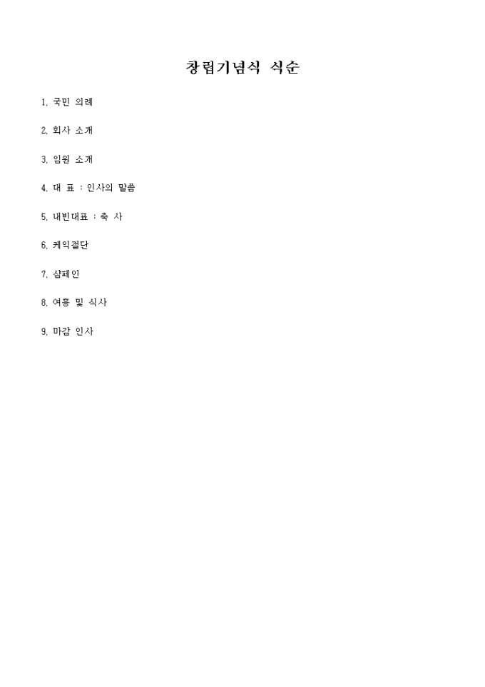 9,000원/월창립기념일식순입니다. 각 회사에서 창립기념일이 되면 기념식을 하는데 그때 사용되는 양식입니다.