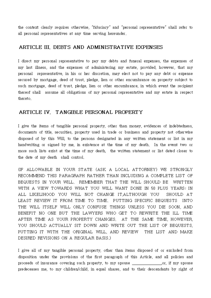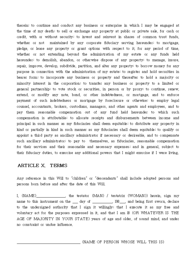 9,000원/월ARTICLE I. HEIRS AND BENEFICIARIES, ARTICLE II. FIDUCIARIES, ARTICLE III. DEBTS AND ADMINISTRATIVE EXPENSES등 모두 10개의 조항으로 구성되어 있는 LAST WILL AND TESTAMENT입니다.