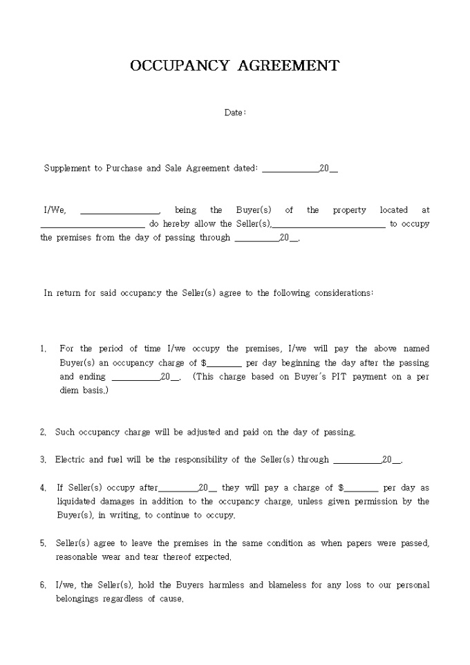 9,000원/월OCCUPANCY AGREEMENT입니다, 아래는 전체내용중 일부분입니다. I/We, __________________, being the Buyer(s) of the property located at ________________________ do hereby allow the Seller(s),__________________________ to occupy the premises from t