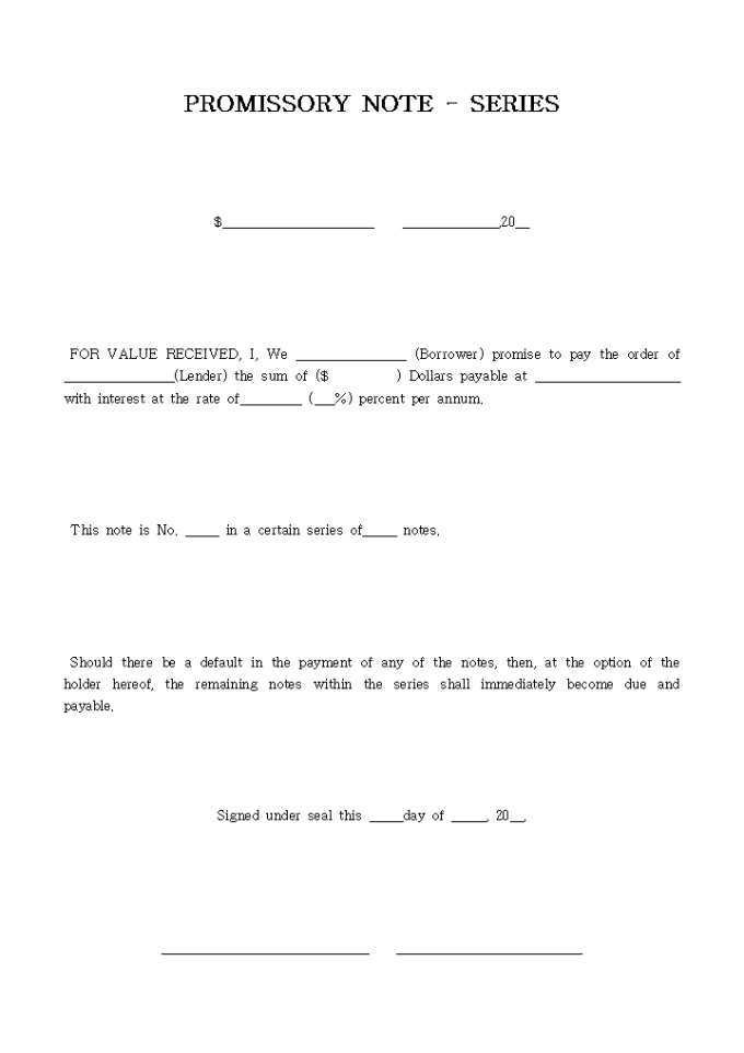 9,000원/월PROMISSORY NOTE - SERIES입니다. 아래는 전체내용의 일부분입니다. $______________________ ______________,19__ FOR VALUE RECEIVED, I, We ________________ (Borrower) promise to pay to the order of ________________(Lender) the sum of ($ ) Dollars payable at