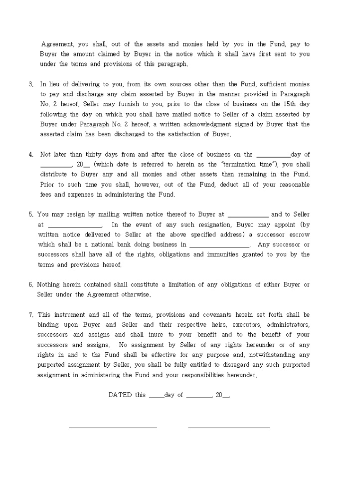 9,000원/월ESCROW AGREEMENT FOR BULK SALES입니다. 아래는 전체내용중 일부분입니다. Pursuant to the terms and provisions of that certain agreement for the sale of the business of___________________ _______________________ (hereinafter called the 'A