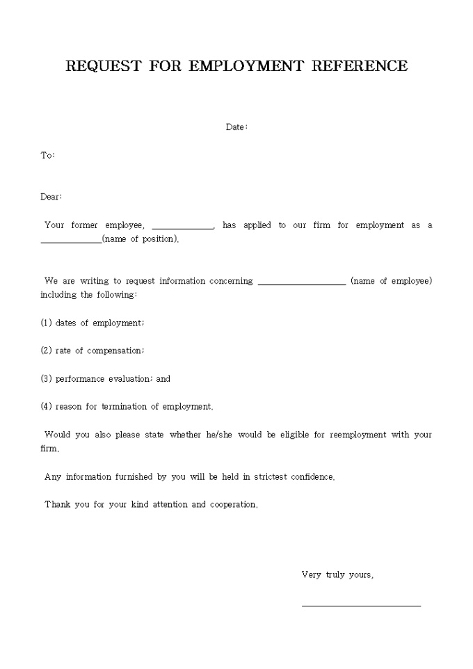 9,000원/월REQUEST FOR EMPLOYMENT REFERENCE입니다. 아래는 전체내용의 일부분입니다. Your former employee, ______________, has applied to our firm for employment as a ______________(name of position). We are writing to request informatio
