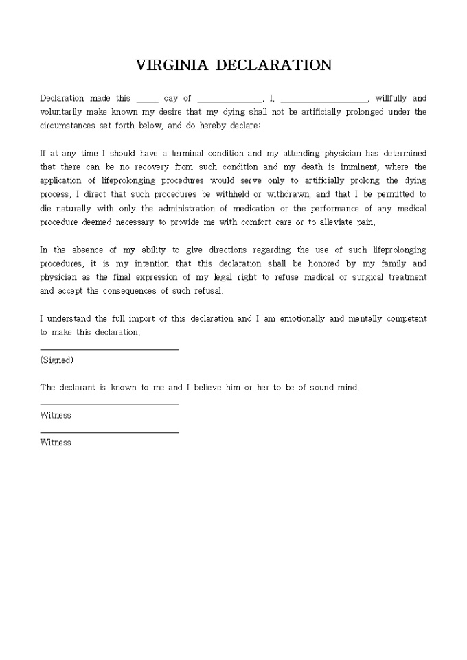 9,000원/월아래는 VIRGINIA DECLARATION의 내용 중 일부입니다. In the absence of my ability to give directions regarding the use of such lifeprolonging procedures, it is my intention that this declaration shall be honored by my family and physician as the final expression of my legal right to refuse medical or surgical treatment and accept the consequences of such refusal.