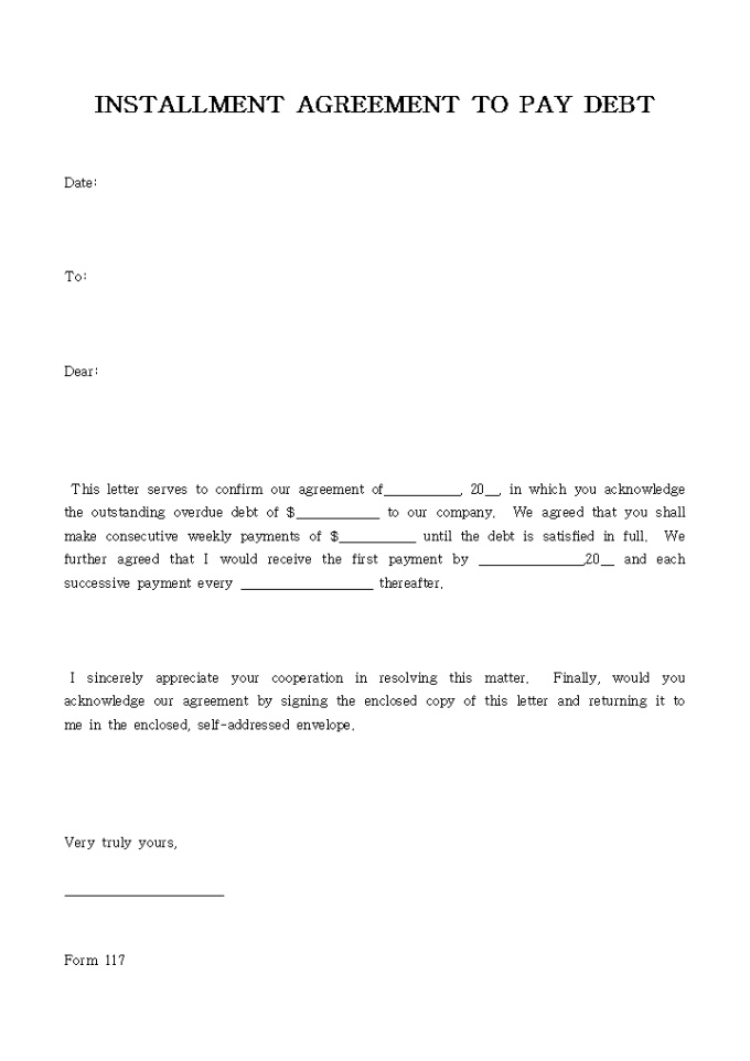 9,000원/월INSTALLMENT AGREEMENT TO PAY DEBT입니다. 아래는 전체문서중 일부분입니다. This letter serves to confirm our agreement of___________, 20__, in which you acknowledge the outstanding overdue debt of $____________ to our company. We agreed that you