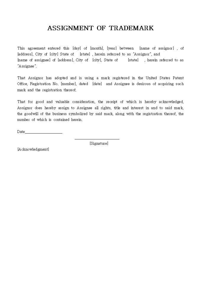 9,000원/월ASSIGNMENT OF TRADEMARK 양식입니다. 아래는 전체내용중 일부입니다. This agreement entered this [day] of [month], [year] between [name of assignor] , of [address], City of [city] State of [state] , herein referred to as 'Assignor', and [name of assignee] of [address],