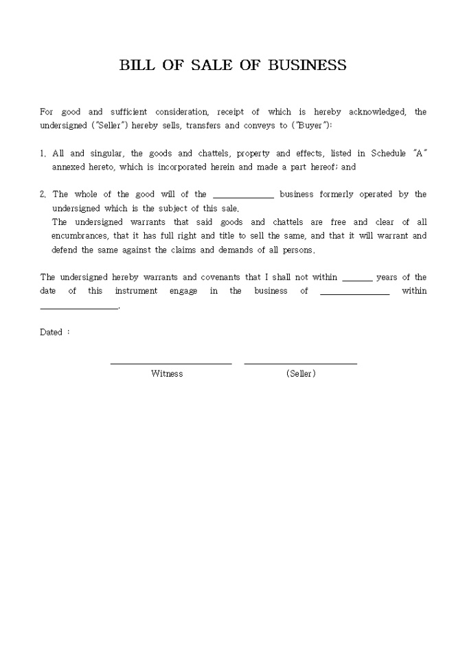 BILL OF SALE OF BUSINESS 양식입니다. 아래는 전체내용중 일부분입니다. For good and sufficient consideration, receipt of which is hereby acknowledged, the undersigned ('Seller') hereby sells, transfers and conveys to ('Buyer'):
