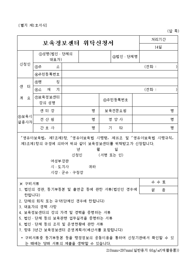 9,000원/월영유아보육법 제7조제3항, 영유아보육법 시행령 제16조 및 영유아보육법 시행규칙 제3조제1항의 규정에 의하여 위와 같이 보육정보센터를 위탁 신청을 할 때 필요한 서식입니다.