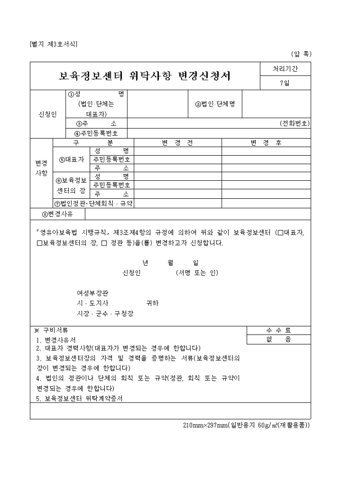 9,000원/월영유아보육법 시행규칙] 제3조제4항의 규정에 의하여 위와 같이 보육정보센터 ( 대표자, 보육정보센터의 장, 정관 등)을(를) 변경 하기 위한 신청서 입니다.