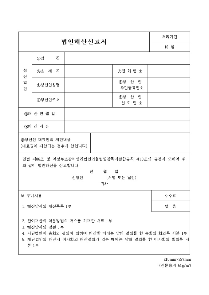9,000원/월민법 제86조 및 여성부소관비영리법인의설립 및 감독에 관한 규칙 제10조의 규정에 의하여 위와 같이 법인해산을 신고할 때 필요한 양식으로 써 처리기간은 접수일로 부터 10일 입니다.