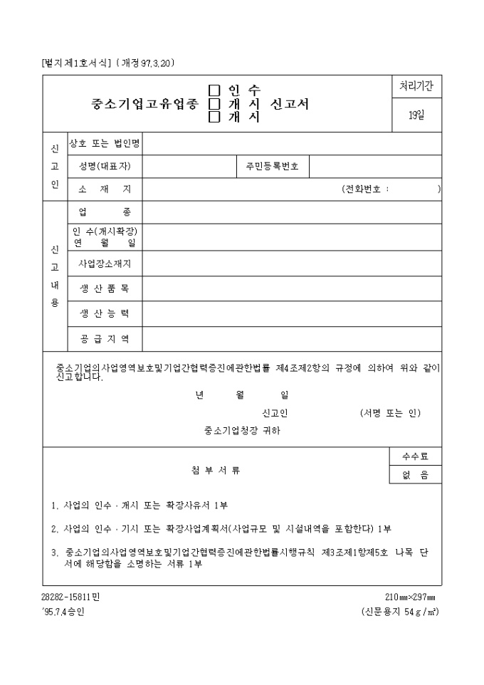 9,000원/월◎ 중소기업고유업종(인수,개시,확장)신고서 ◎ 대기업자 등이 중소기업 고유업종을 인수·개시 또는 확장하고자 할 경우에 신고 ◎ 근거법령 ㅇ중소기업의사업영역보호및기업간협력증진에관한법률 제4조 ㅇ동법 시행령 제4조 ㅇ동법 시행규칙 제4조 ◎ 구비서류 ① 신청서 1부 [별지 제1호 서식] ② 사업의 인수·개시 또는 확장사유서 1부 ③ 사업의 인수·개시 또는 확장사업계획서(사업규모 및 시설내역을 포함한다) 1부 ④ 동법 시행규칙 제3조 제1항 제5호 나목 단서에 해당함을 소명하는 서류 1부(필요시 첨부)