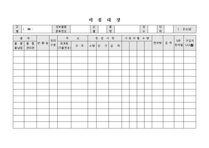 9,000원/월군별, 정부물품번호, 순별, 품명, 정수, 결재, 일자, 적요, 증감사항, 사용처별 수량 등으로 구성되어 있는 비품 대장 양식 입니다.