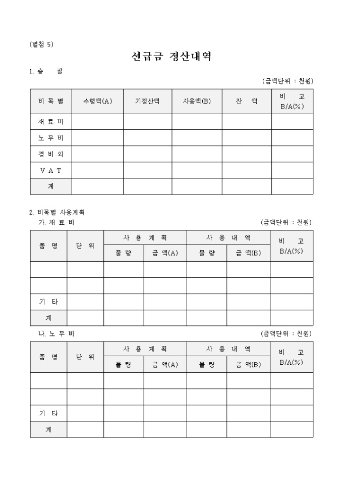 9,000원/월재료비, 노무비, 경비외, 부가가치세의 수령액, 기정산액, 사용액, 잔액, 비고에 해당하는 사항들의 기재할 수 있는 형식으로 구성되어 있는 선급금 정산 내역 양식 입니다.