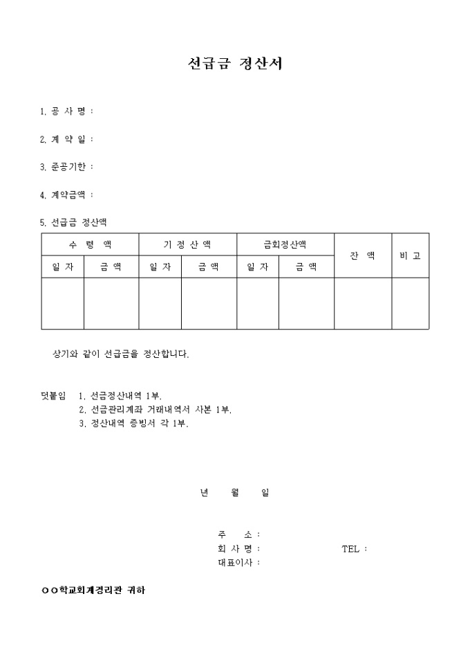 9,000원/월공사명, 계약일, 준공기한, 계약금액과 수령액, 기정산액, 금회정산액, 잔액, 비고의 선급금 정산액의 항목으로 구성되어 있는 선급금 정산서 입니다.