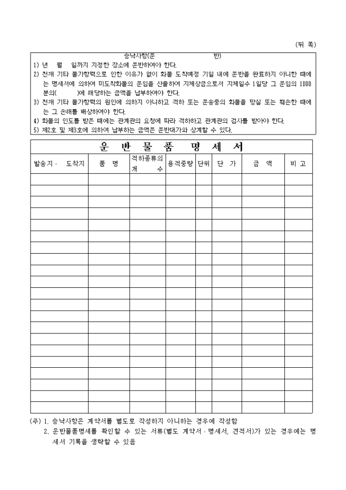 9,000원/월지출결의서와 운반물품명세서 2장으로 구성되어 있으며 다음은 운반물품명세서 작성요령 입니다. 승낙사항은 계약서를 별도로 작성하지 아니하는 경우에 작성함, 운반물품명세를 확인할 수 있는 서류(별도 계약서, 명세서, 견적서)가 있는 경우에는 명세서 기록을 생략할 수 있습니다.