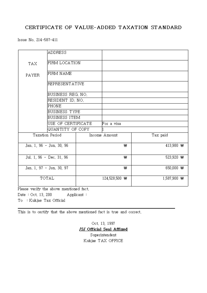 9,000원/월CERTIFICATE OF VALUE-ADDED TAXATION STANDARD(영문부가가치세납부증명서) 양식입니다. TAXPAYER, Taxation Period, Income Amount, Tax paid등의 항목으로 구성되어 있습닏다.