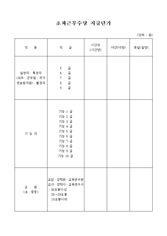 9,000원/월직종, 직급, 시간외(시간당), 야간(야당), 휴일(일당)에 따라 초과근무수당을 기재 할 수 있는 초과근무 수당 지급단가 양식 입니다.