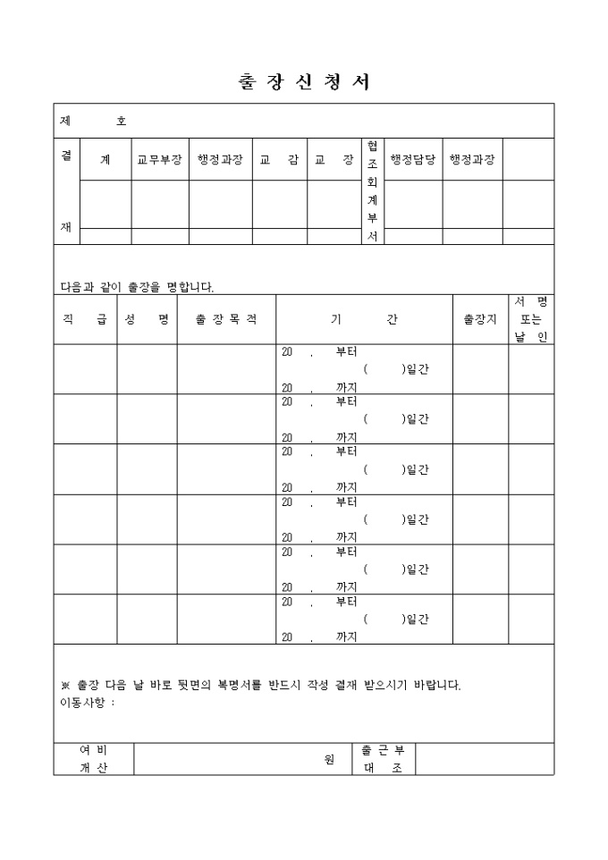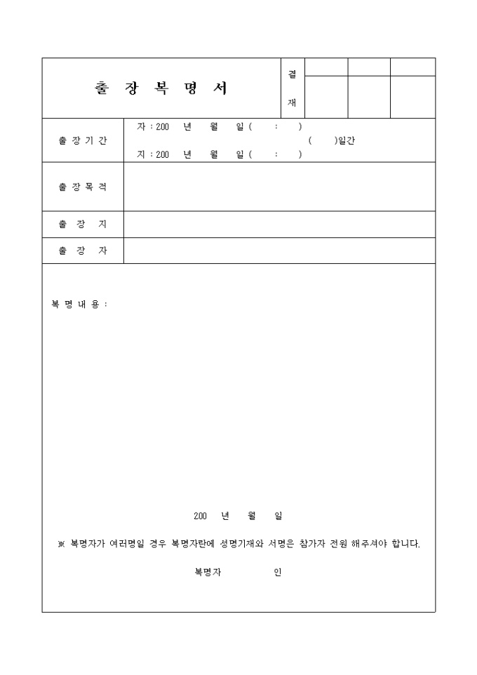 9,000원/월출장신청서와 출장복명서 2장으로 구성되어 있으며 출장복명서는 출장기간, 출장목적, 출장지, 출장자등의 항목으로 구성되어 있습니다.