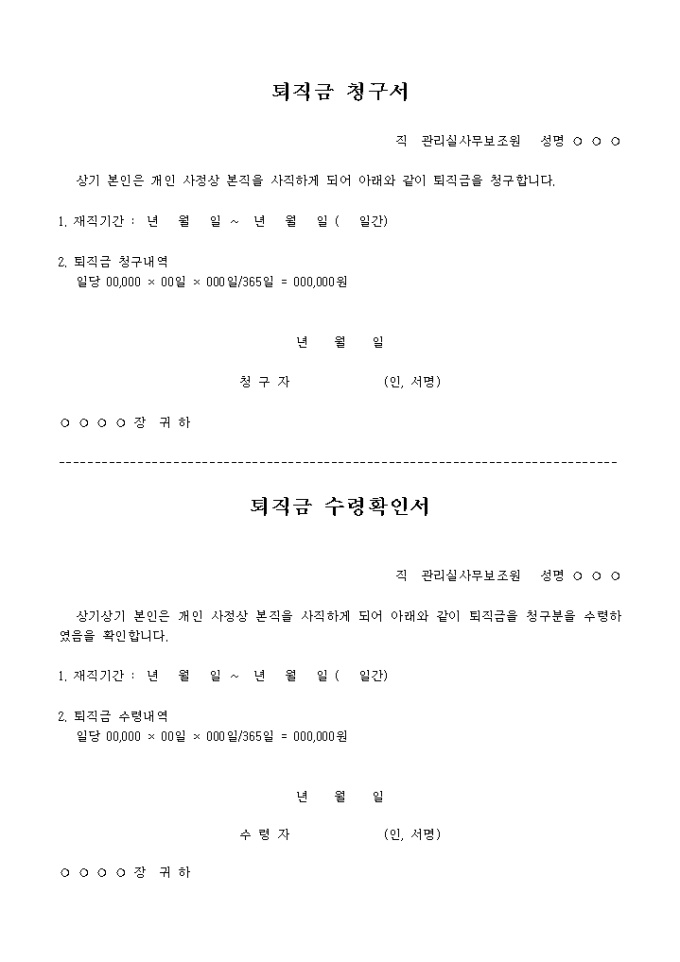 9,000원/월퇴직금 청구서, 퇴직금 수령 확인서 2개의 서식으로 구성되어 있으며 재직기간과 퇴지금 수령내역의 항목이 있습니다.
