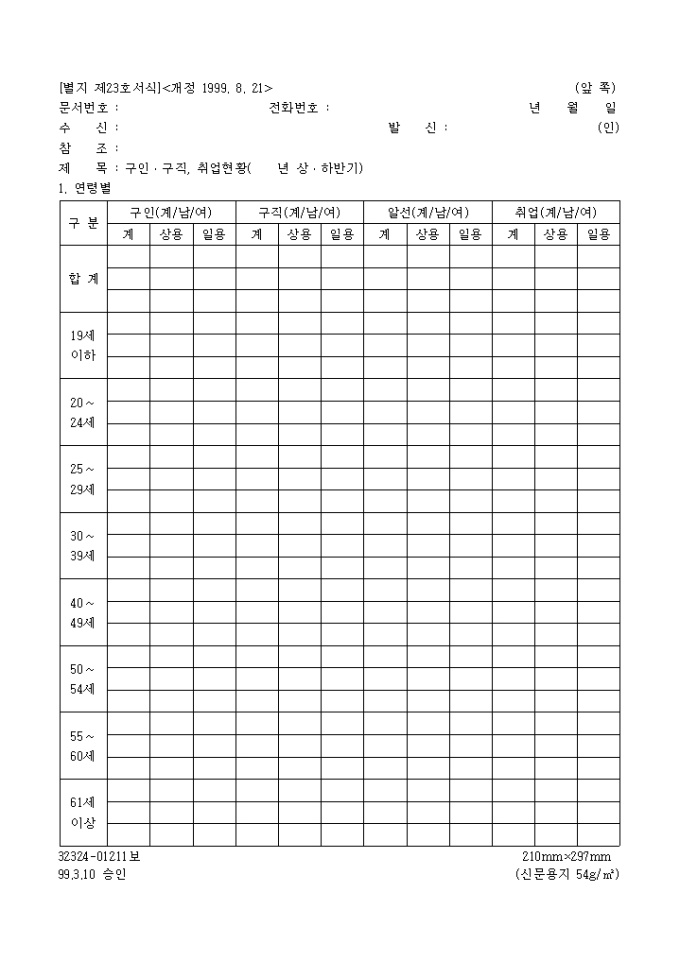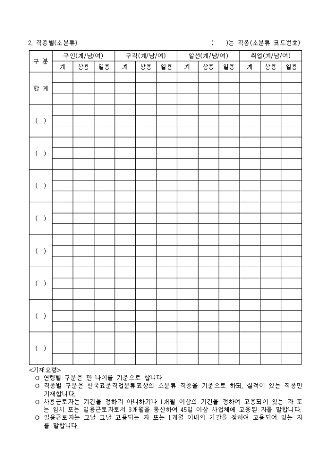 9,000원/월성별, 연령, 상용과 일용에 따른 취업현황을 2장의 표로 나타낸 구인 및 구직 취업현황 양식 입니다.