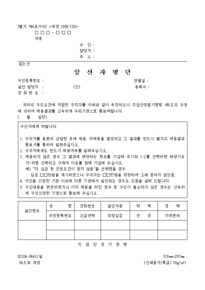 9,000원/월구인등록번호, 알선담당자, 전화번호, 알선번호, 알선직종, 학력,전공, 자격면허 등으로 구성되어 있는 알선자 명단 양식 입니다.