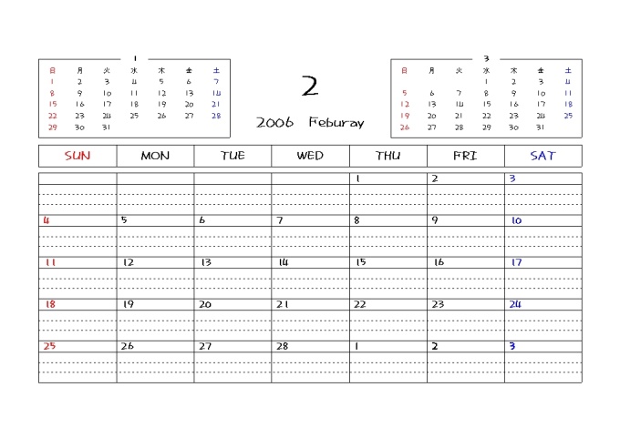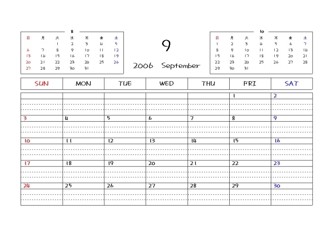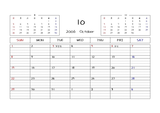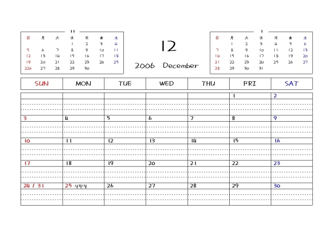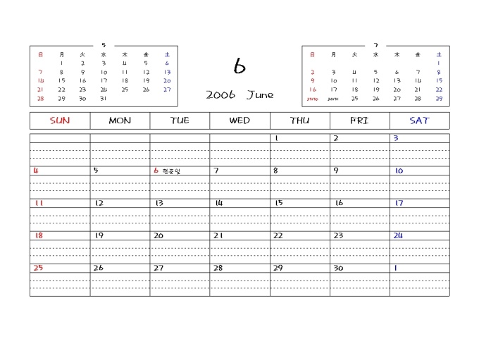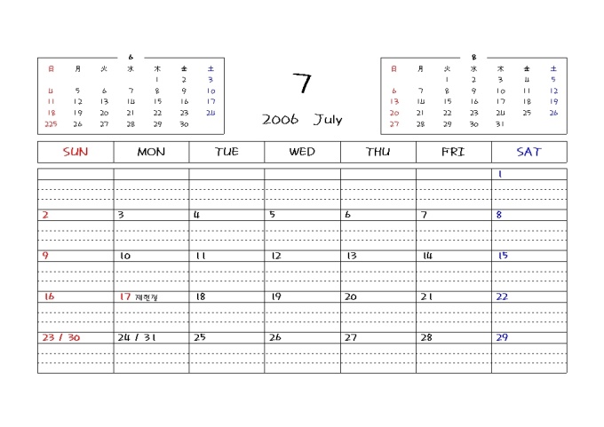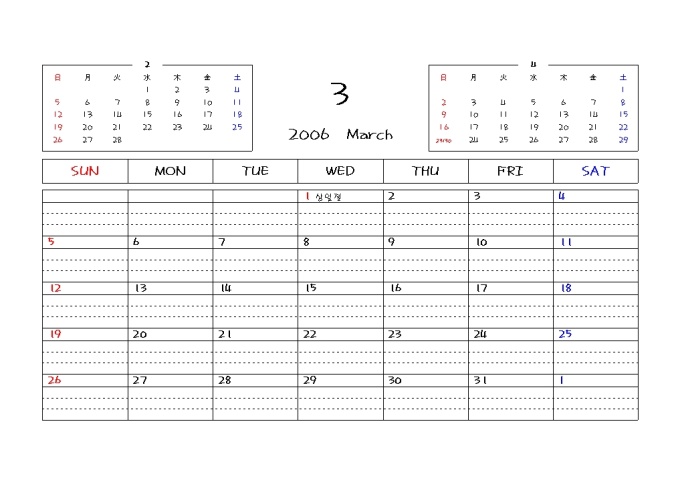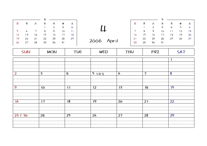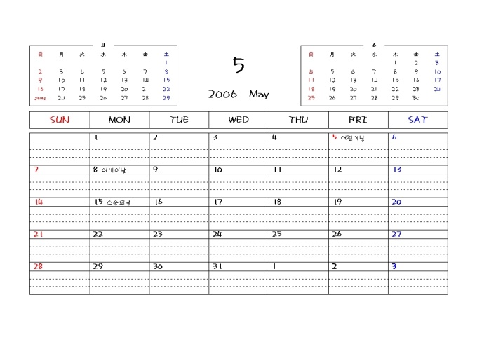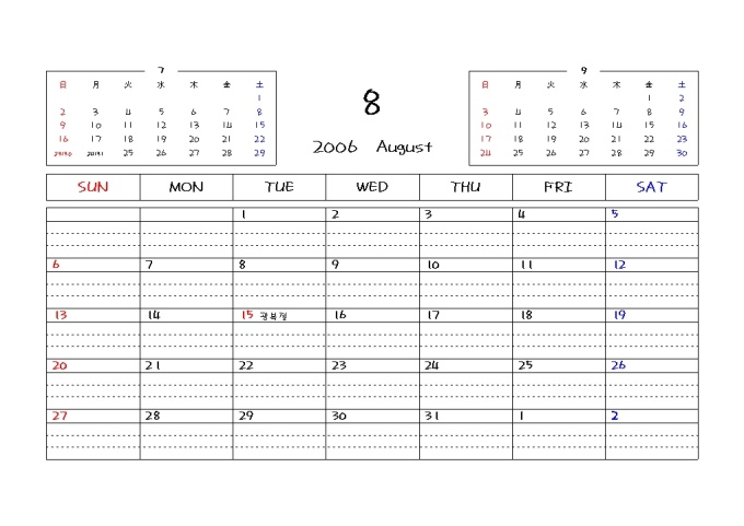9,000원/월2006년 달력(일별메모가로형식)입니다. 가로형식의 달력으로 각 일별에 점선이 있어 간단한 메모를 하실때 보기 좋게 기입할 수 있는 달력입니다.