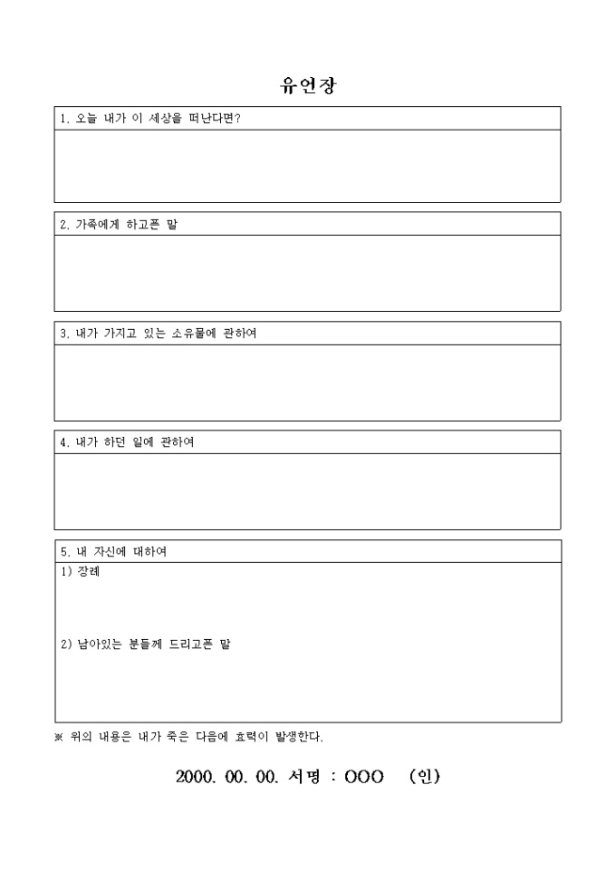 9,000원/월´오늘 내가 이 세상을 떠난다면´ ´가족에게 하고픈 말´ ´내가 가지고 있는 소유물에 관하여 ´ ´내가 하던 일에 관하여 ´ ´내 자신에 대하여 ´로 구성된 유언장 양식입니다.