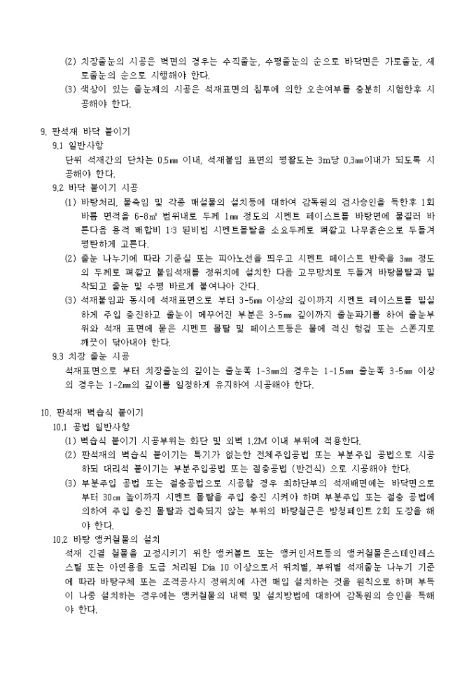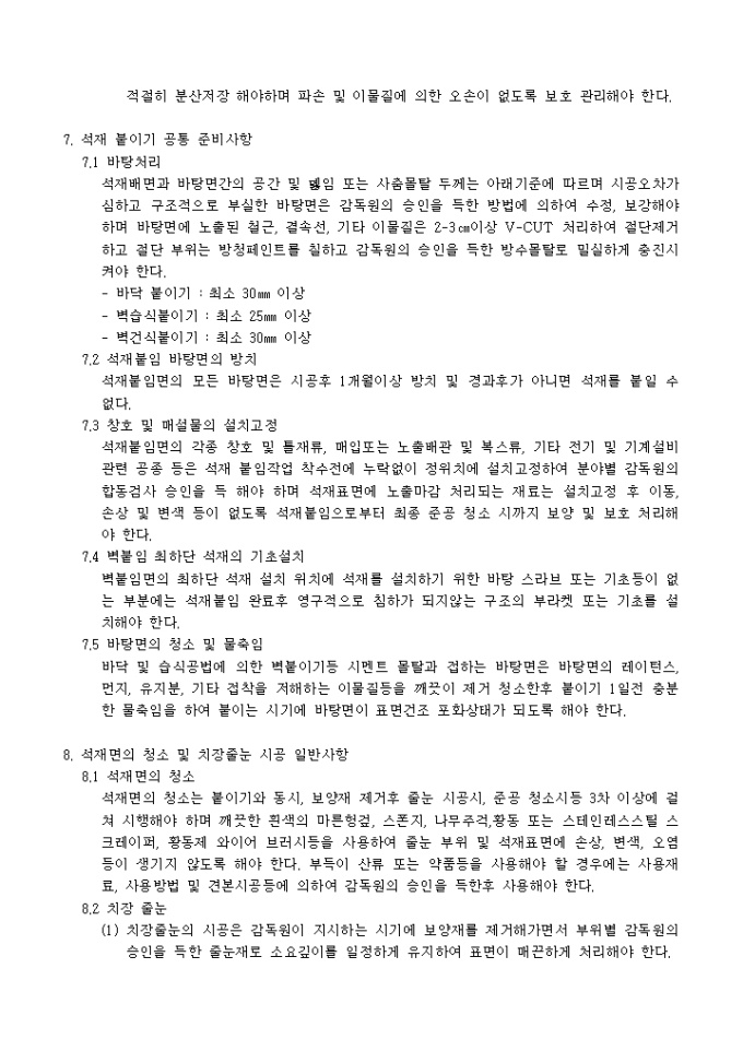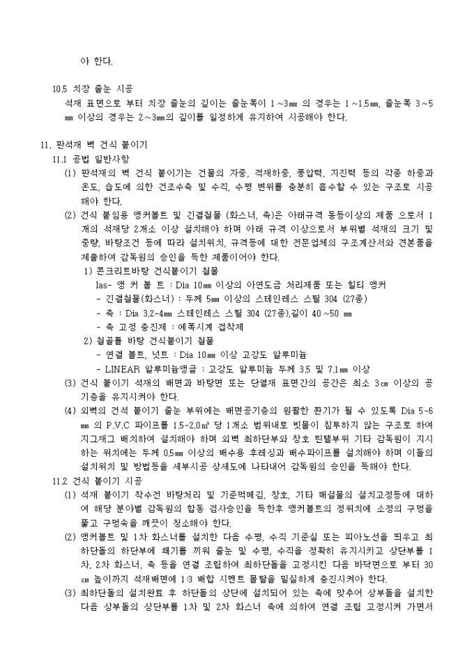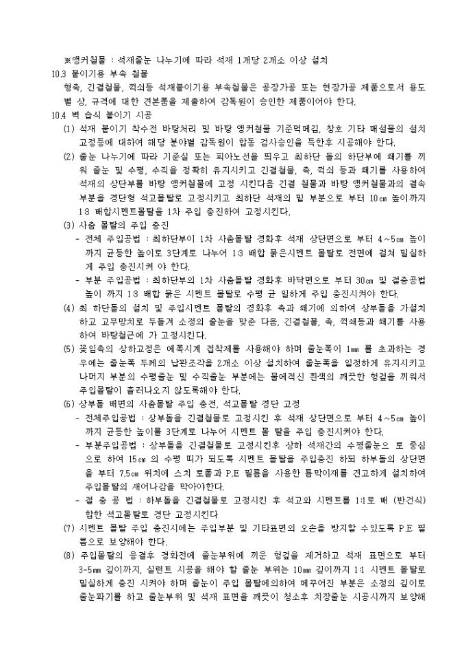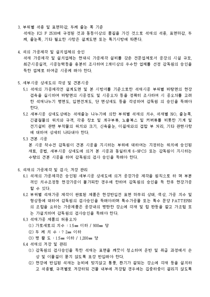 9,000원/월아래의 항목으로 이루어진 석공사 시방서입니다. 1. 적용범위 2. 재료 일반사항 3. 부위별 석종 및 표면마감, 두께 줄눈 폭 기준 4. 석의 가공제작 및 설치업체의 승인 5. 세부시공 상세도의 작성 및 견본시공 6. 석재의 가공제작 및 검사, 저장 관리 7. 석재 붙이기 공통 준비사항 8. 석재면의 청소 및 치장줄눈 시공 일반사항 9. 판석재 바닥 붙이기 10. 판석재 벽습식 붙이기 11. 판석재 벽 건식 붙이기 12. 석재면의 보양 및 청소