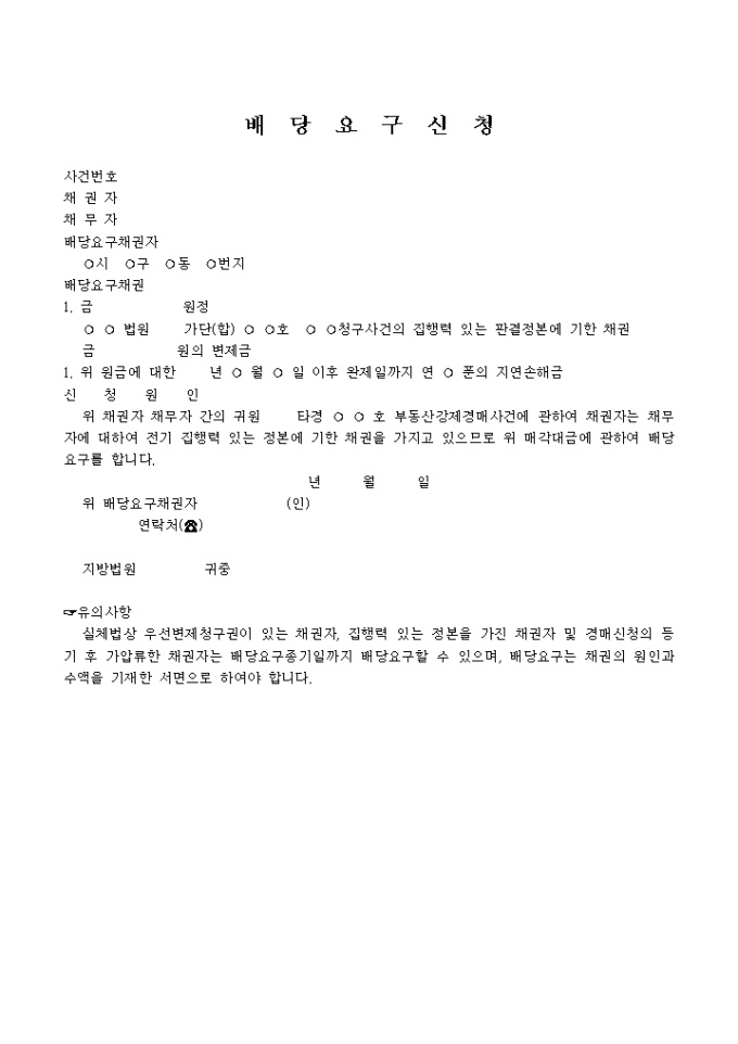 9,000원/월실체법상 우선변제청구권이 있는 채권자, 집행력 있는 정본을 가진 채권자 및 경매신청의 등기 후 가압류한 채권자는 배당요구종기일까지 배당요구할 수 있으며, 배당요구는 채권의 원인과 수액을 기재한 서면으로 하여 야 한다는 내용의 배당요구신청서 입니다.