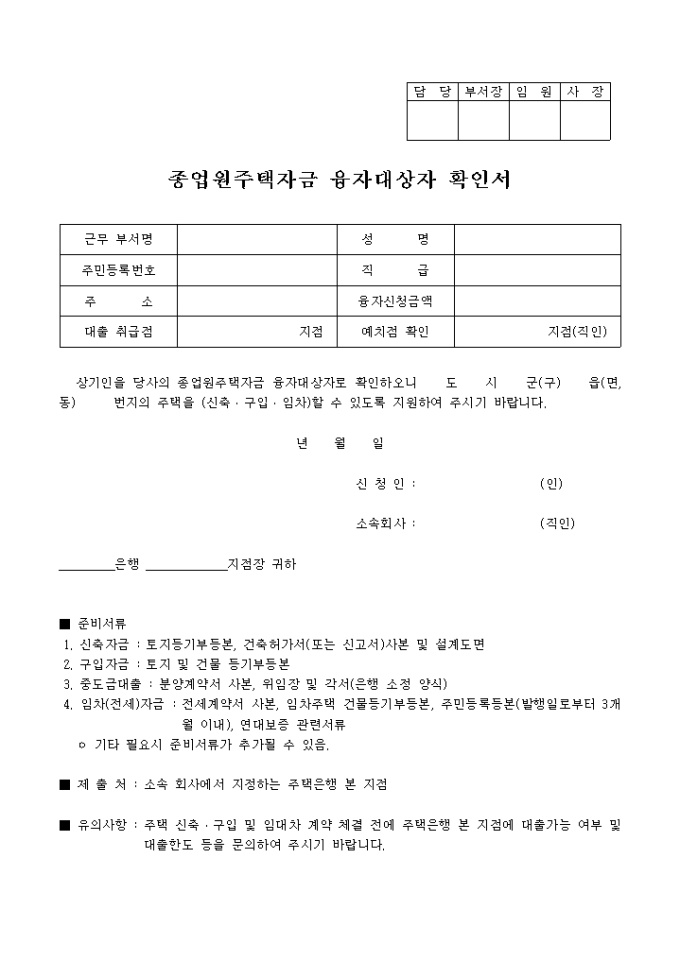 종업원 주택자금융자 대상자 확인서
