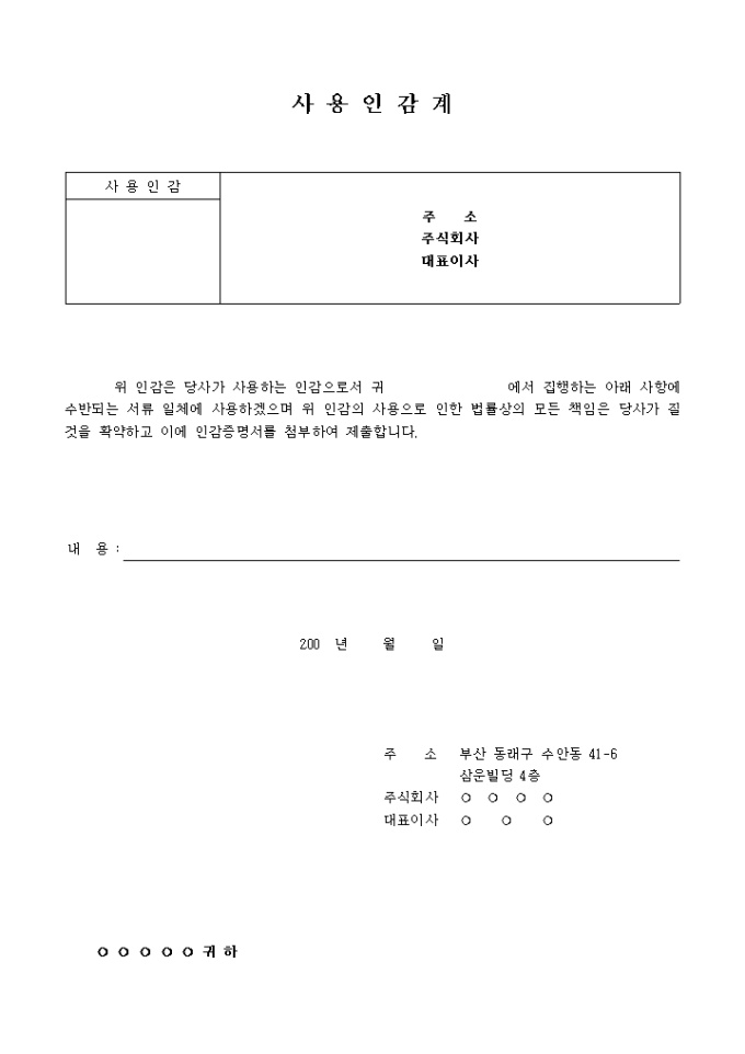 인감의 사용으로 인한 법률상의 모든 책임은 당사가 질 것을 확약하고 이에 인감증명서를 첨부하여 야 하는 제출사용인감계양식 입니다.