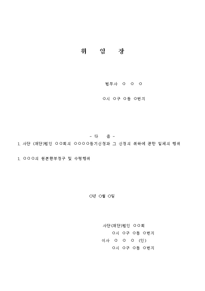 9,000원/월사단(재단)법인 000회의 등기신청과 그 신청의 취하에 관한 일체의 행위, 000의 원본환부청구 및 수령행위를 위임한다는 내용의 위임장양식 입니다.